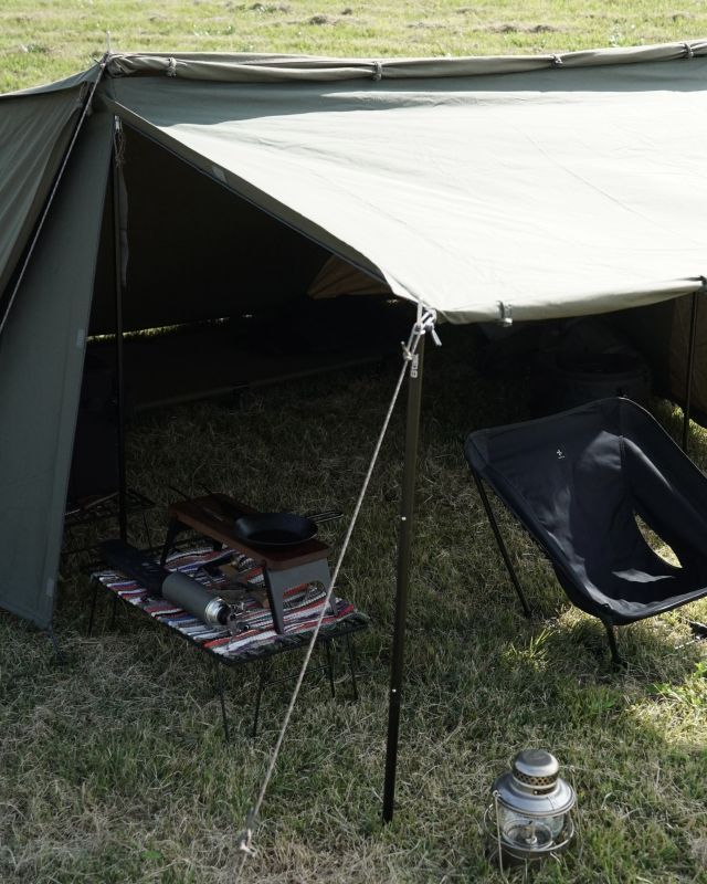 このシルエットに憧れて購入しました。 主にデイキャンプに使い、大きさも日帰りでより扱いやすく感じています。 コットンの風合いもよく、色々と試しましたが、このタープに落ち着きました。