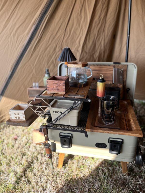 フォールナットのガード、真鍮のプレート、レザーが装飾されてされていますが、シンプルにデザインが纏まっていて気に入っています。 蓋に付いている取っ手が車への積載の時にとても便利です。
