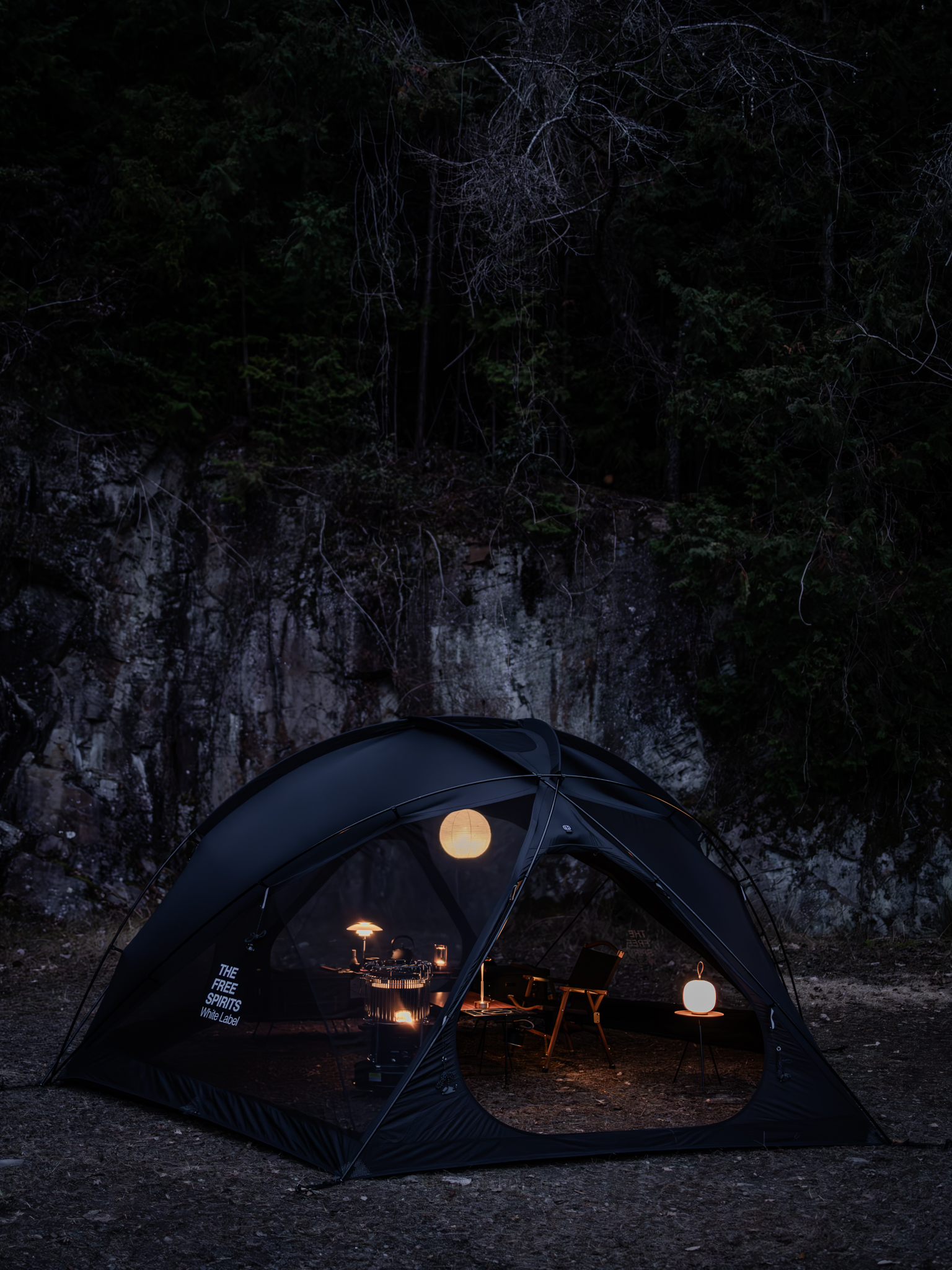 崖が印象的なキャンプ場で、テント内のレイアウトをする前のワンシーン。 岩肌と冬の木々、無彩色のテントが合わさることで冬らしいグレイッシュな感じになり、いい雰囲気でした。
